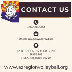 Mail to: Arizona Region Volleyball, 2220 S. Country Club Dr, Ste 108, Mesa, AZ 85210